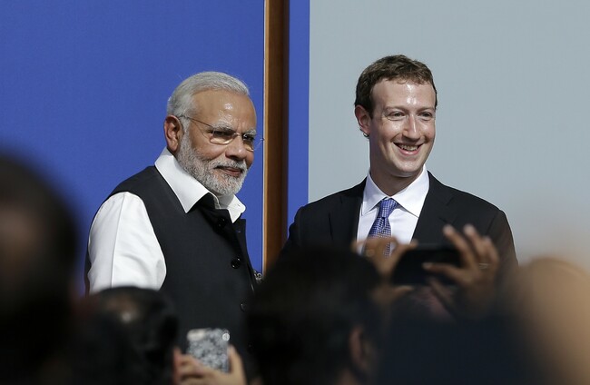 Facebook CEO Mark Zuckerberg met with Indian prime minister Narendra Modi at its HQ back in September, but its plans for the country have hit a major setback. AP Photo/Jeff Chiu