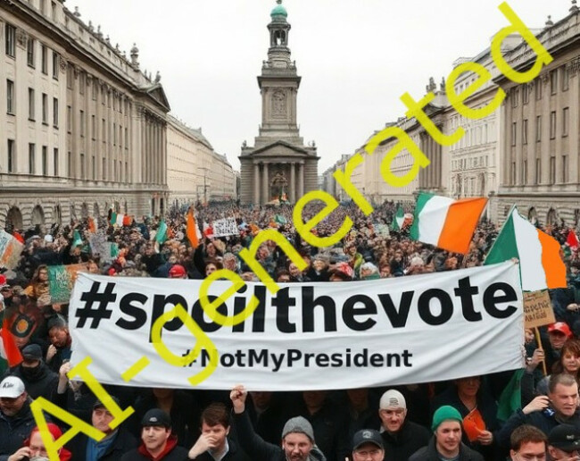 Another obviously AI-generated photo shows hundreds of people marching and waving tricolours behind a #spoilthevote banner, standing on a street reminiscent of O’Connell Street in Dublin, but which doesn’t match any real location.
