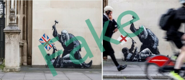IMAGES OF A now-destroyed Banksy mural at the back of a London courthouse have been altered to make them appear to show a judge with a gavel attacking a person holding an English national flag.