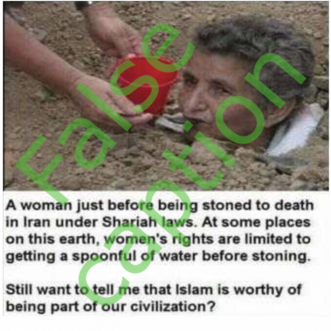 “A woman just before being stoned to death in Iran under Shariah laws,” dozens of identical posts on social media read. “At some places on this earth, women’s rights are limited to getting a spoonful of water before stoning.”