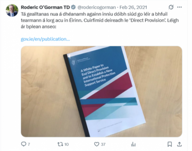 However, they do not invite anyone to Ireland. Instead, they translate to: “We are making a new commitment to all asylum seekers in Ireland. We are ending direct provision. Read our plan here,” followed with a link.