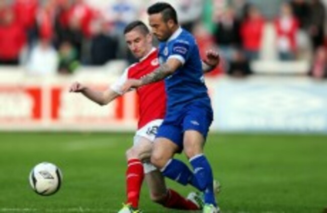 Ian Bermingham of St Pat's and Sligo striker Rafael Cretaro. INPHO/Donall Farmer