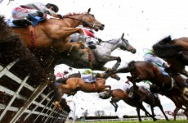 Runners and riders crash through the hurdles at Fairyhouse yesterday. INPHO/Morgan Treacy