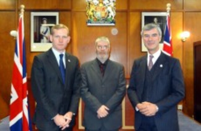 The British Foreign Office Minister Jeremy Browne (l) with Assembly chair Gavin Short (c) and governor Nigel Haywood (r) on the Falkland Islands today. Emma Hallett/PA Wire/Press Association Images