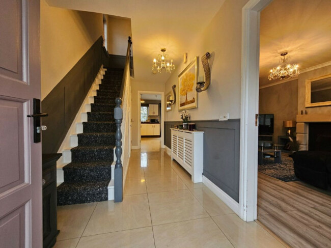 For sale by private treaty through Tommy Carmody’s Property House, from the moment you step inside this 111 m² home, the sense of space is evident. The home has been finished to an exceptionally high standard throughout, creating an atmosphere that is both stylish and comfortable. A bright, well-considered hallway sets the tone, leading into a wonderfully proportioned living room at the front of the house. Here, a large bay window floods the space with natural light, while an elegant feature fireplace provides a cosy focal point, making it an ideal retreat for cosy evenings in.