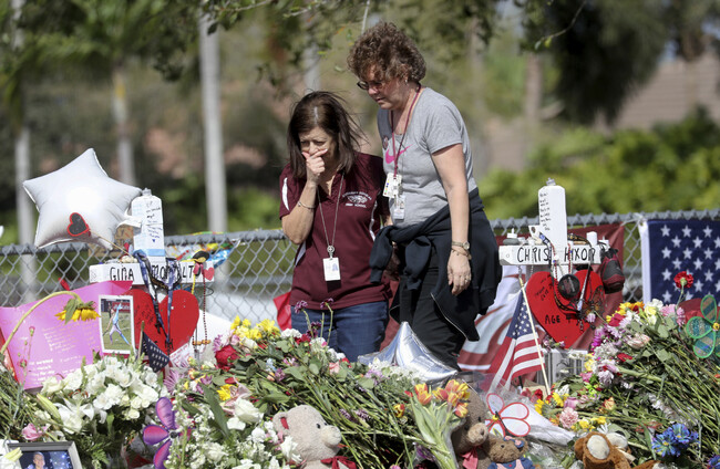 Margarita Lasalle, a bookeeper and Joellen Berman, a guidance data specialist look at the memorial after returning to the school. Mike Stocker via PA Images