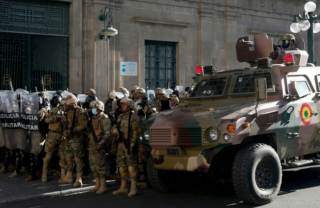 An armored vehicle and military police form outside the government palace at Plaza Murillo in La Paz, Bolivia. Alamy Stock Photo