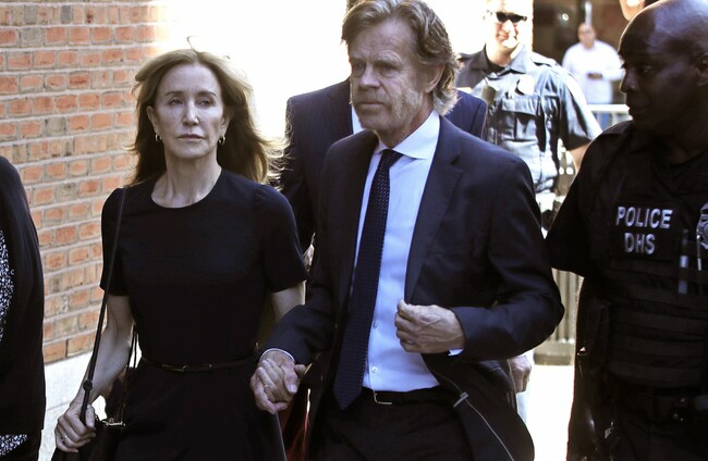 Felicity Huffman arrives at federal court with her husband William H. Macy for sentencing in a nationwide college admissions bribery scandal. Elise Amendola via AP