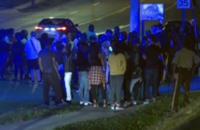Crowd gathers near the scene where a police officer was shot. AP