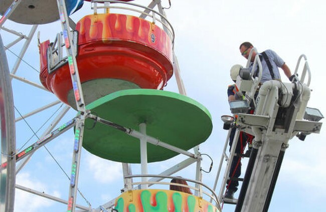 Members of the Greeneville Fire Department help people off the Ferris wheel at the Greene County Fair. AP