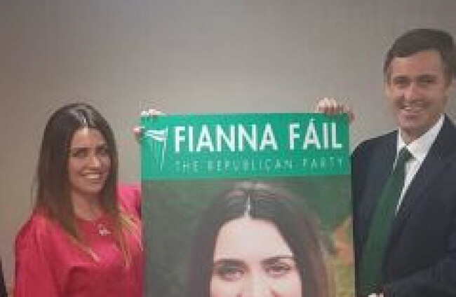 Standing next to Ó Cuív, as well as Daly, McAnespy was photographed holding a photo of herself with the Fianna Fail branding. The two politicians announced that they were the directors for her election campaign.