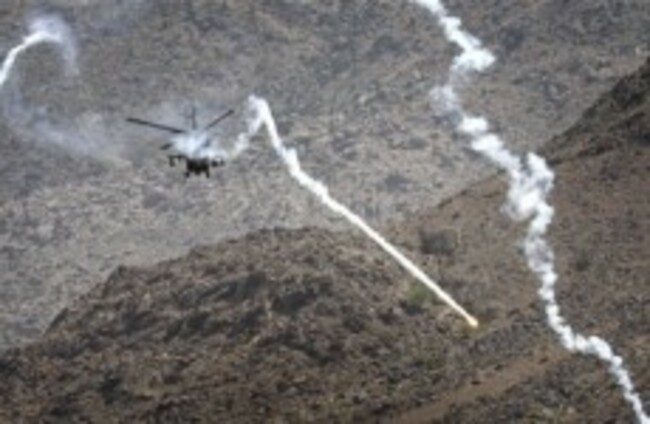 A coalition helicopter fires flares around a building, unseen, believed occupied by Taliban fighters in Kuz Kunar, Nangarhar province east of Kabul, Afghanistan, on Sunday 17 July AP Photo/Rahmat Gul