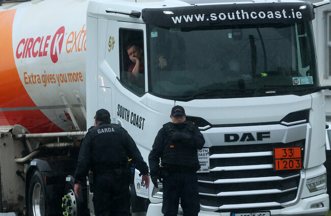The fuel trucks entered the facility under garda escort after gardaí asked protesters for the keys to their vehicles so they could be moved without the use of the Defence Forces heavy-lift vehicle which was at the site.