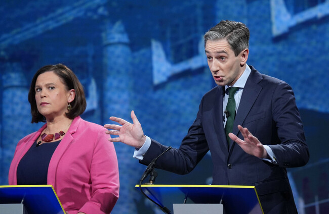Mary Lou McDonald and Simon Harris during an election debate last year. Alamy Stock Photo