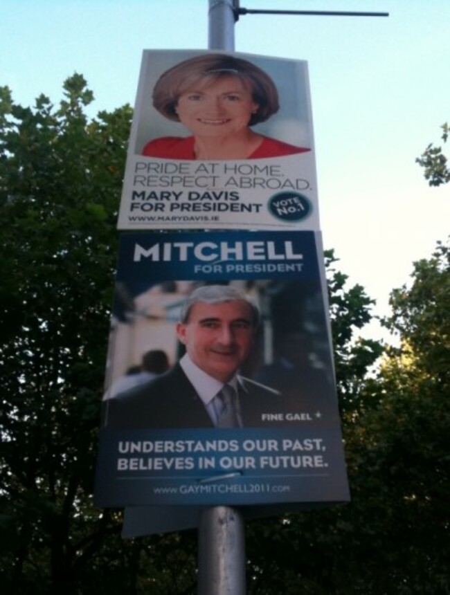 Posters promoting the independent (Davis) and Fine Gael (Mitchell) candidates’ presidential runs appeared in Dublin city centre this morning. The pair’s campaign teams appeared to come up with the exact same slogan earlier this month, give or take a comma.