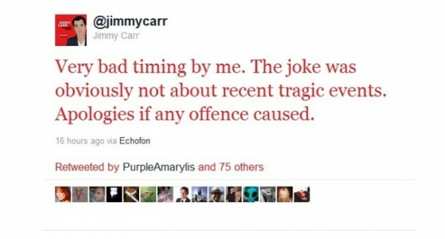 UK comedian Jimmy Carr came under fire after tweeting a joke about a car crash on his official Twitter account at the weekend.