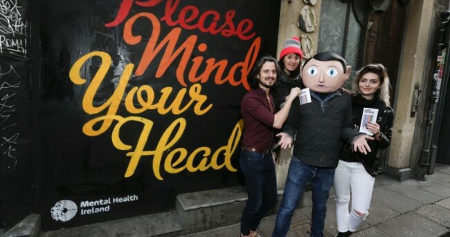 Launching the First Fortnight mental health arts festival were Frank, from Lenny Abrahamson's acclaimed movie 'Frank', musician Conall Ó Breacháin (We Cut Corners), actress & musician Tara Lee (The Fall) and comedian Eleanor Tiernan. Conor McCabe