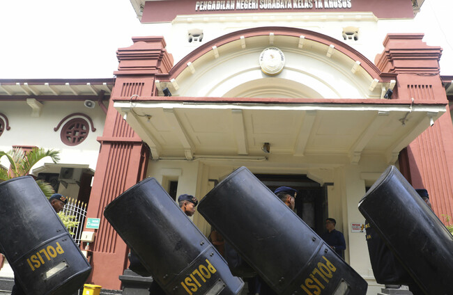 Police carry riot shields in front of a court building in Surabaya, Indonesia. Authorities deployed hundreds of security personnel around the court for security reasons. Trisnadi