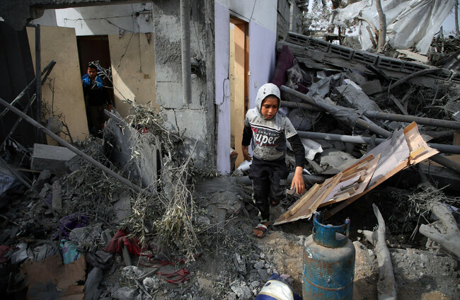 A boy walks through the rubble after an Israeli airstrike in the southern Gaza Strip city of Rafah. Alamy