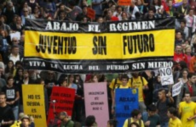 Protesters march in Madrid and hold banners reading, 'A youth with no future'. (AP Photo/Andres Kudacki)