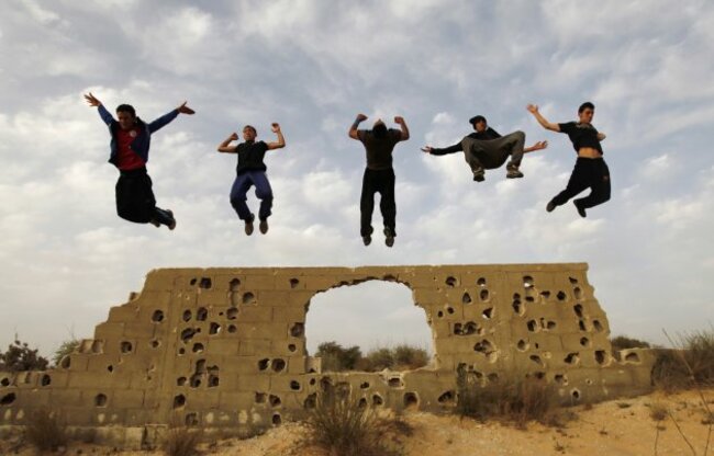 Palestinian youths practice their parkour skills in Khan Younis, southern Gaza Strip. Pic: AP Photo/Hatem Moussa