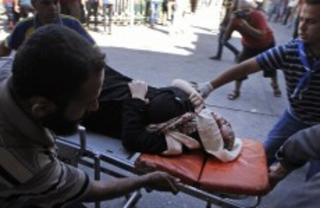 Palestinians wheel a woman wounded in the strike on the school to an emergency room. AP/Press Association Images