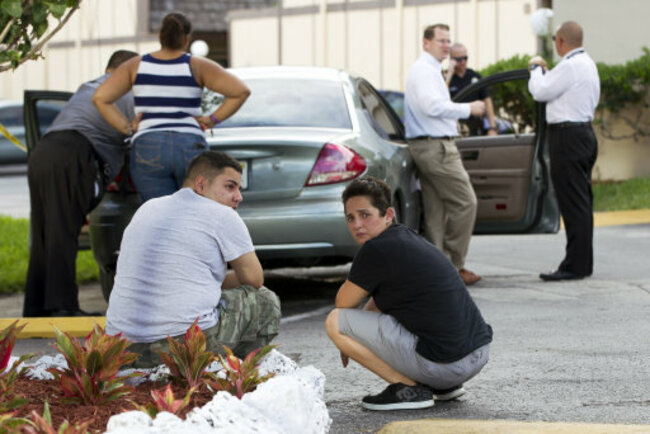 (Two people sit behind a police car as Miami police officers investigate a murder. Photo: J Pat Carter/ PA Images)