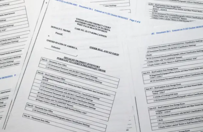 Pages from a FBI property list of items seized from former president Donald Trump’s Mar-a-Lago estate (Jon Elswick/AP)