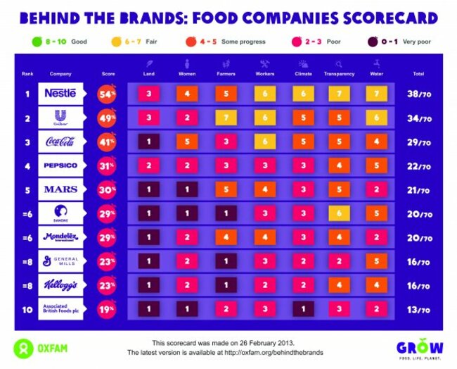 INTERNATIONAL AGENCY OXFAM has said that the social and environmental policies of the world’s ten biggest food and beverage giants are failing millions of people who who supply land, labour, water and commodities needed to make their products.