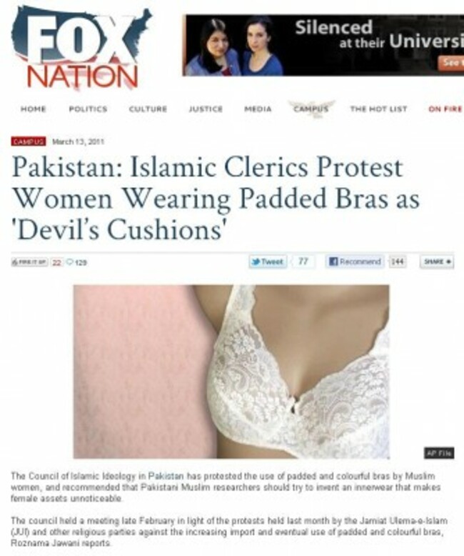 US NEWS ORGANISATION Fox News has fallen for a Pakistani satirical website’s report that Islamic clerics are campaigning to ban padded bras because they are “the devil’s cushions”.