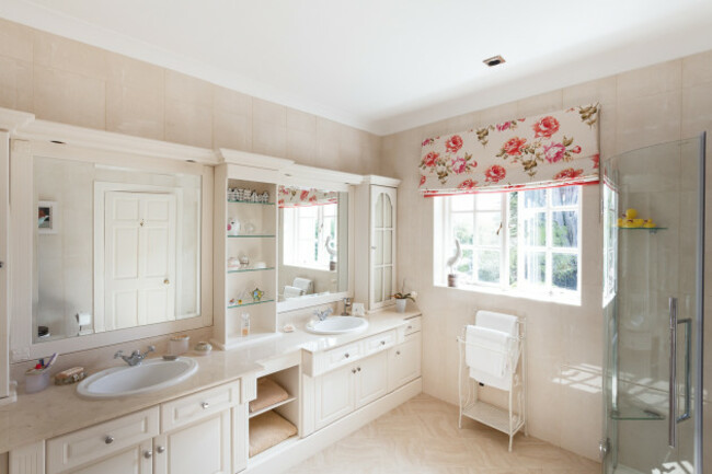 The family bathroom features a corner bath, extra large shower and custom-built vanity units.