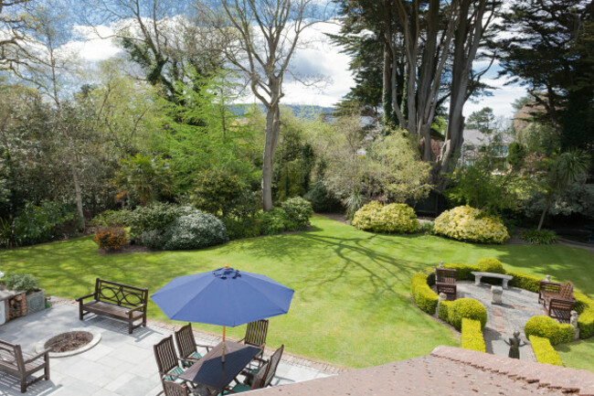The back garden has a sun terrace, another paved area with benches, a fountain and a reading nook.
