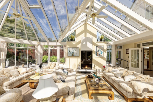 The ground floor has a versatile layout ideal for both family living and entertaining. The formal drawing room, filled in natural light from large windows, opens into a striking conservatory with a gas fireplace and marble-tiled flooring. From here, enjoy views of the sunny garden and its patio areas. The heart of the home, a fully fitted kitchen with solid wood cabinetry and polished granite countertops, is complemented by an overhead skylight and double French doors that lead outside. Adjacent is a utility room for added handiness.