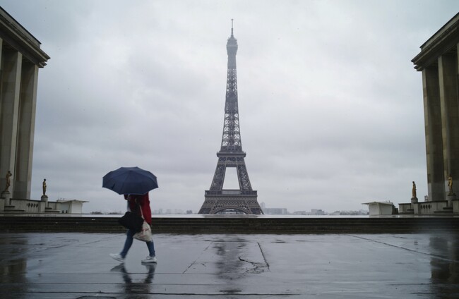 A woman walks on the deserted Trocadero square today in front of the Eiffel Tower during nationwide confinement measures to counter Covid-19. AP/PA Images