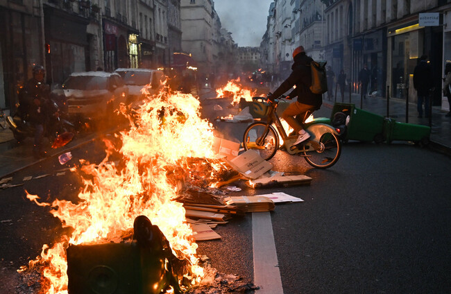 Parisian resident riding a bike in the middle of burning garbage cans during a demonstration in Paris last night. PA Images