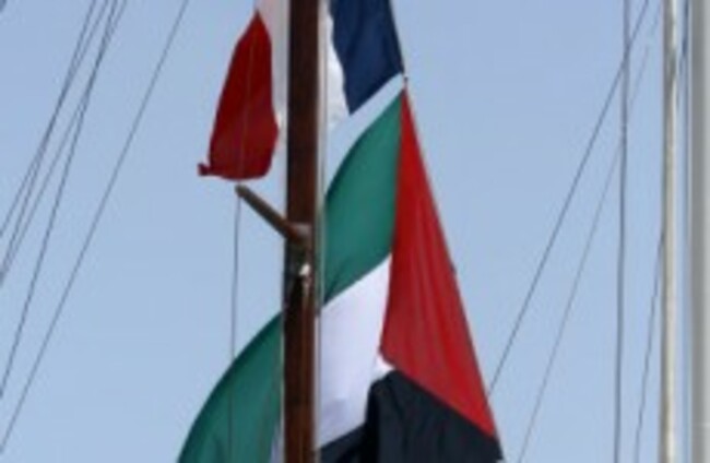 French and Palestinian flags flying on a ship moored in Piraeus yesterday. AP Photo/Darko Bandic