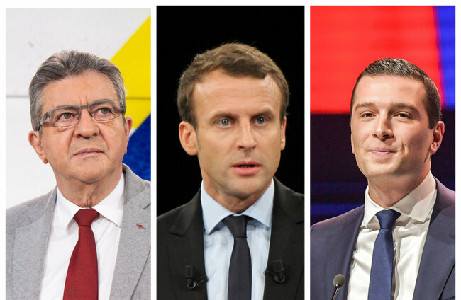 (Left to right) Jean-Luc Mélenchon, Emmanuel Macron and Jordan Bardella.