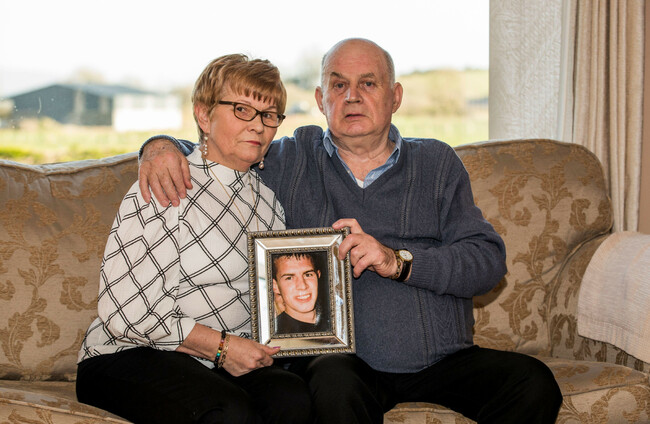 Breege and Stephen Quinn with a picture of their murdered son, Paul Quinn. Liam McBurney/PA Wire