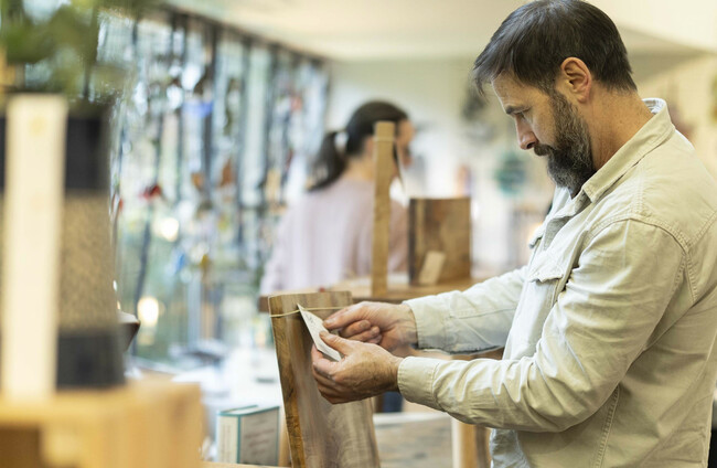 Mindful 2 Paul Murphy examining one of his creations at the Glucksman Craft & Design Fair. C. Keogh. C. Keogh.