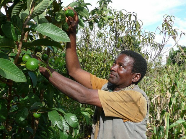 Farmer Nelson Mkwaila introduced fertiliser trees like Gliricidia in his maize and fruit fields. Image: Charlie Pye-Smith/Agroforestry Food Security Programme/Flickr.