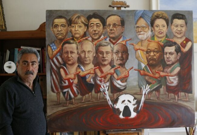 Political painter Kaya Mar poses with a painting depicting the G8 world leaders, left ‘plus five’ leaders, right, pointing towards each other in blame for world problems as ‘the planet is sinking’ according to him. Pic: AP Photo/Lefteris Pitarakis