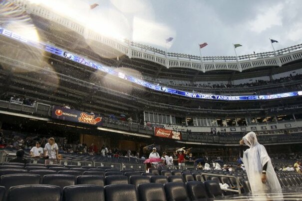 Fans take cover during a rain delay in the seventh inning of a baseball game between the New York Yankees and the Toronto Blue Jays. (AP Photo/Seth Wenig)