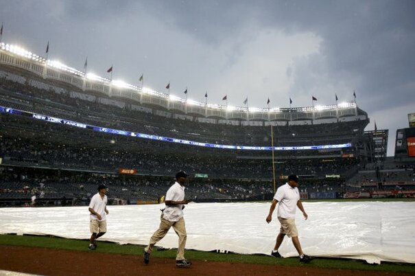 The grounds crew covers the field during a rain delay in the seventh inning of a baseball game between the New York Yankees and Toronto Blue Jays. (AP Photo/Seth Wenig)