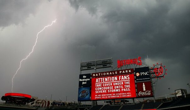 A bolt of lightning comes down from the clouds near Nationals Park before a baseball between the Washington Nationals and the New York Mets. (AP Photo/Alex Brandon)