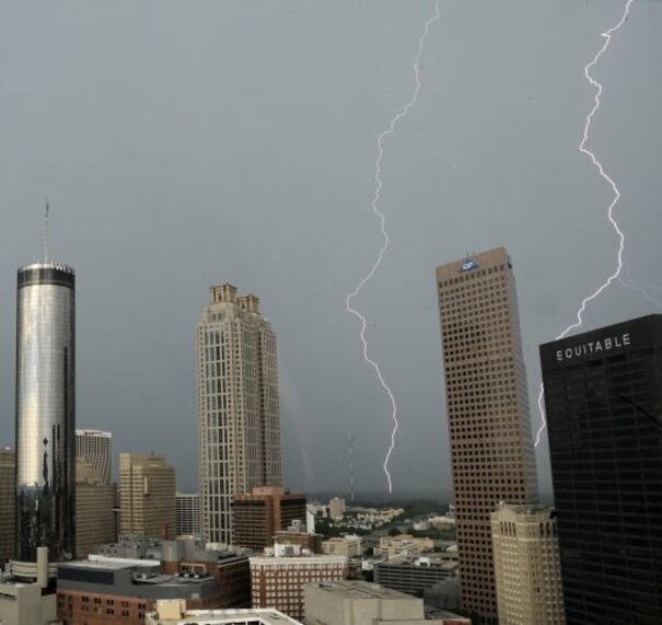 Lightning strikes over downtown during a thunderstorm, Wednesday, in Atlanta. Strong storms that rumbled across parts of Georgia dropped hail on parts of metro Atlanta and bolts of lightning that caused house fires. (AP Photo/Mike Stewart)