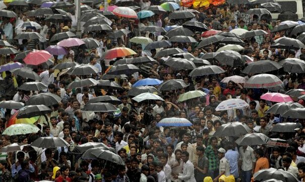 Fans and mourners hold umbrellas as it rains during the funeral of Bollywood superstar Rajesh Khanna in Mumbai, India. (AP Photo/ Rajanish Kakade)