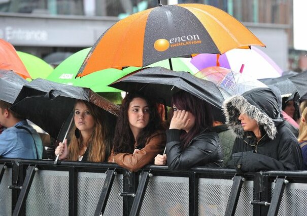Fans wait in the rain at the Echo Arena in Liverpool to watch the Boot Camp performances in this year's series of the X Factor. (David Richards: Optimus Images Ltd)