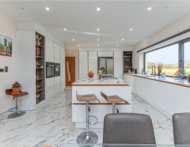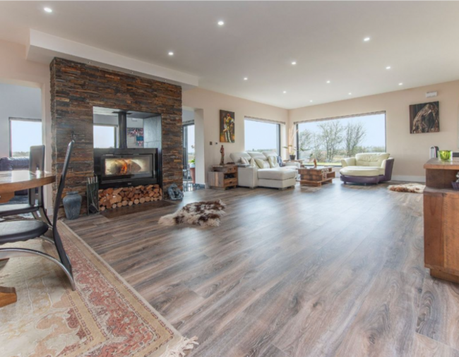 The entrance hall sets the tone with sleek tiled flooring and clean architectural lines. From here, the home unfolds into a series of impressive reception spaces. A substantial living room, bathed in natural light from four large windows, centres around a double-sided solid fuel stove by Stanley, creating both a visual focal point and a powerful heat source. An adjoining lounge, complete with sliding doors and rooflight, offers a more relaxed setting for family evenings or entertaining.