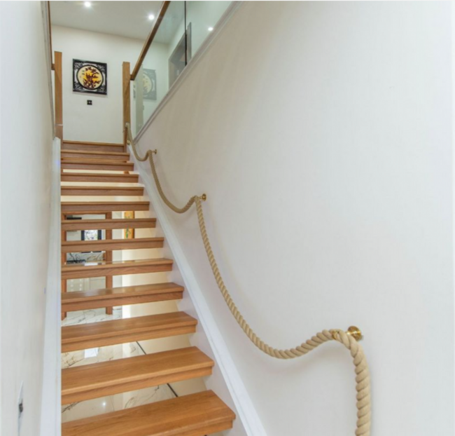 A particularly striking architectural feature is the open-tread solid oak staircase, subtly lit with recessed lighting, which links all three levels and enhances the sense of light and flow throughout.