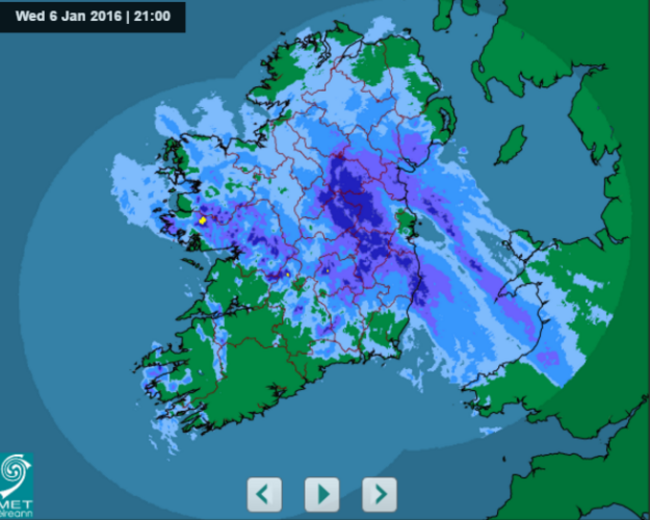 This is how Ireland’s rainfall radar is looking tonight, with heavy rain to continue into tomorrow morning. Met Éireann warned sleet on northern hills will likely add to flooding in affected areas.